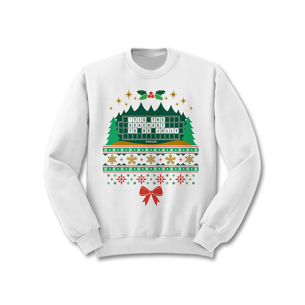 Celebrate the holidays with this exclusive Wheel of Fortune Christmas sweatshirt! This white sweatshirt is covered with ornaments, snowflakes, stars, and trees in holiday colors. The sweatshirt features a Wheel of Fortune game board with a Phrase puzzle revealed. Best of all, the answer is 'Tis the Seacrest To Be Jolly! This sweatshirt is a cotton/poly fleece blend and is machine washable.