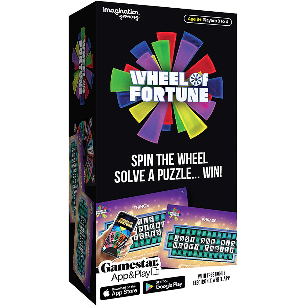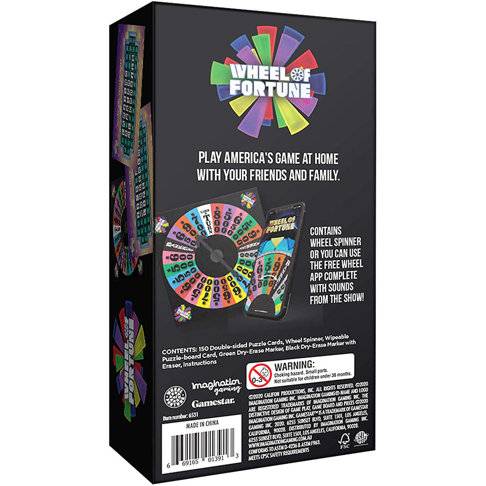 Bring Wheel of Fortune into your home and play with friends and family. This game is made for 3-4 players and includes 150 double-sided puzzle cards, 1 wheel spinner, 1 wipeable puzzle board card, 1 green dry erase marker, 1 black dry erase marker with eraser, and 1 instruction sheet. For extra fun, download the free Gamestar+ App with sound effects straight from the show! You can use the included wheel spinner or use the wheel spinner in the app to play. Spin the wheel, solve a puzzle, and win!