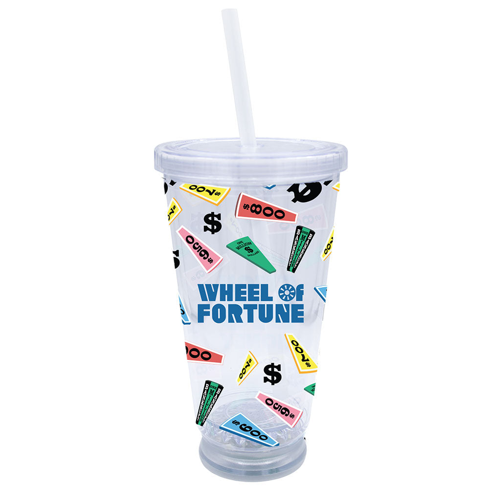 Big Money is only a sip away! This light up tumbler features an all-over Wheel of Fortune wedge pattern along with the words "C'mon Big Money" on one side and the Wheel of Fortune logo on the other side.
