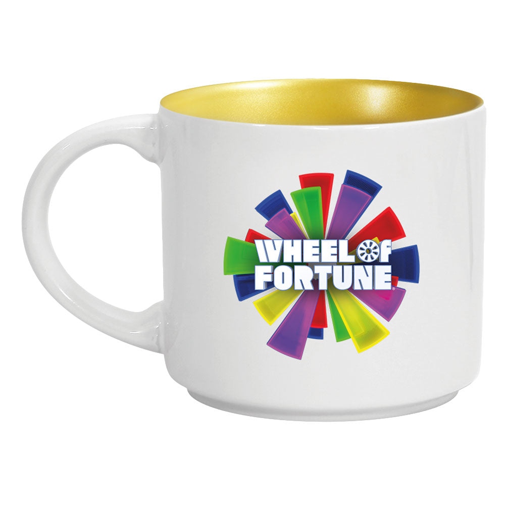 Enjoy your favorite hot or cold beverage with this Wheel of Fortune logo mug! This mug features a vibrant geometric wedge Wheel of Fortune logo and a metallic-gold interior.